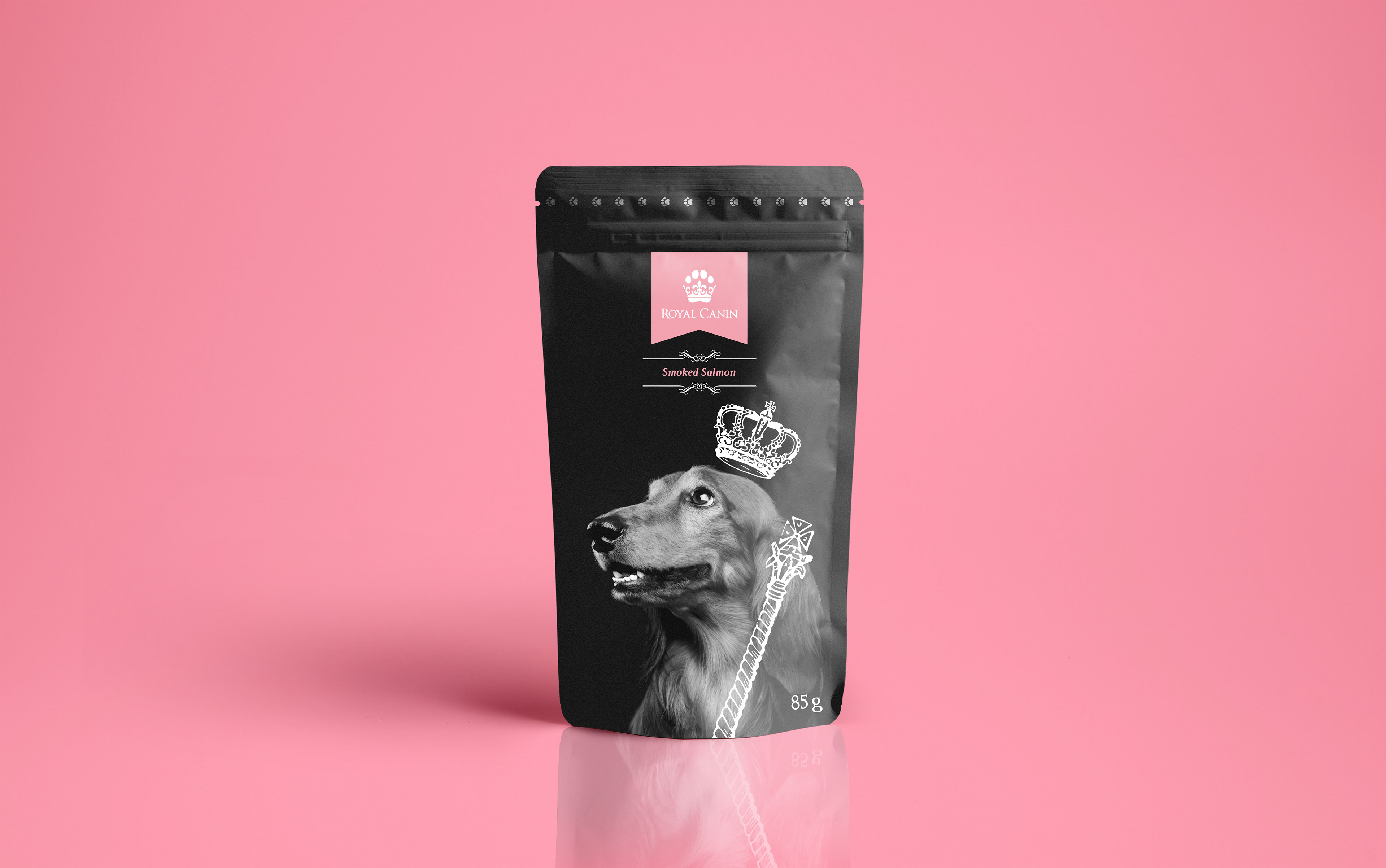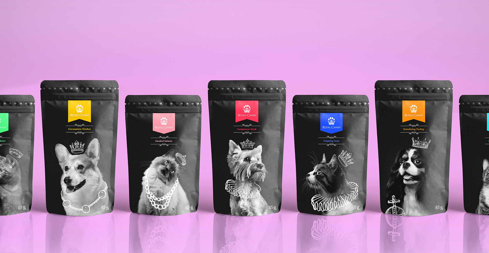 The packaging was completed in monochrome colours to create a sense of quality associated with the brand. The black and white imagery makes colour co-ordinating the different types of dog and cat food clear and simple, so consumers know exactly what they're buying for their animals. With each packet featuring a different colour to represent a different type of food. Each packaging design features an image of a different bread of dog, making differentiation between the different types of dog food even clearer while adding a stronger sense of personality within the brand. Featuring iconic dogs related to royalty, such as Corgis and King Charles Spaniels.