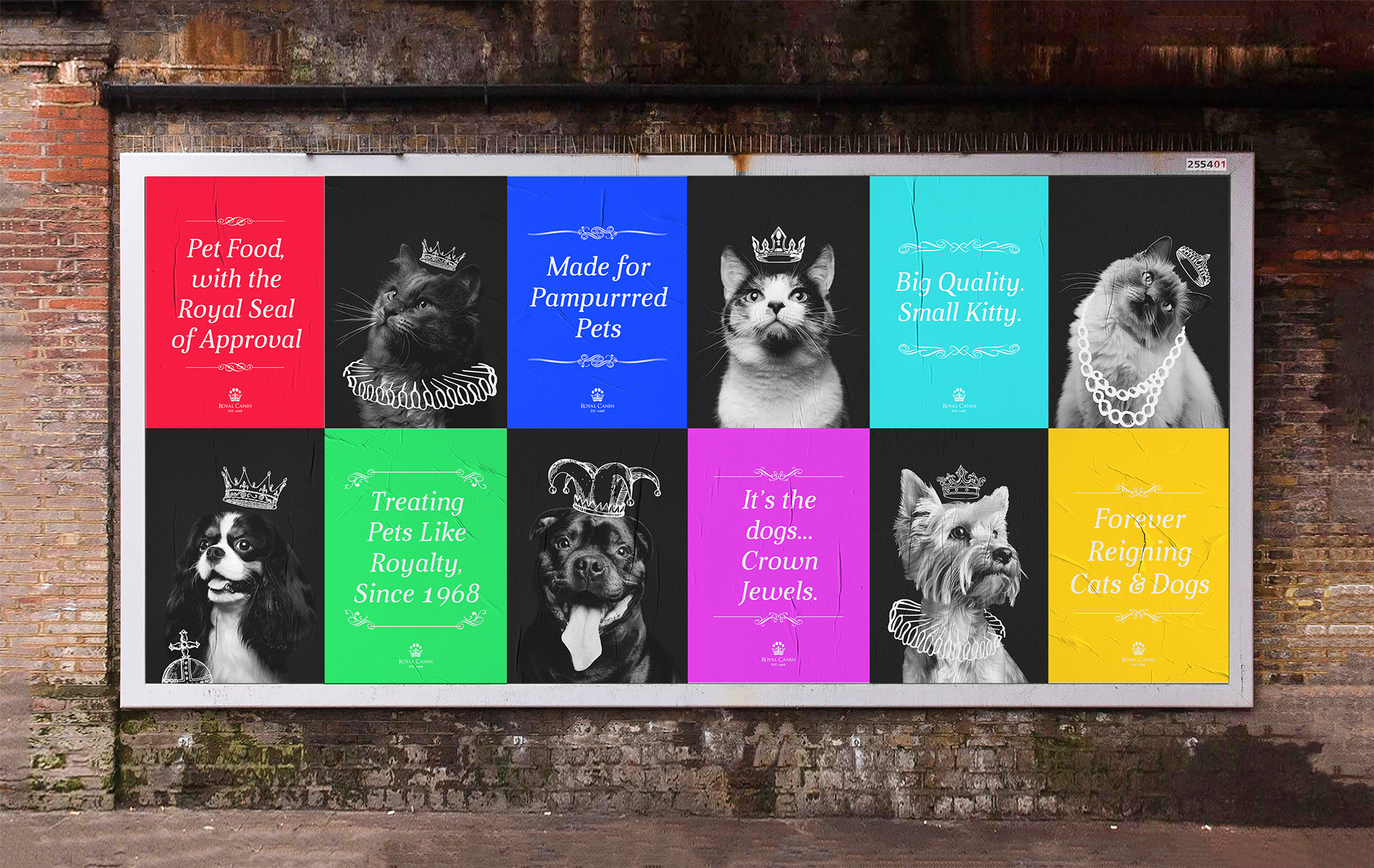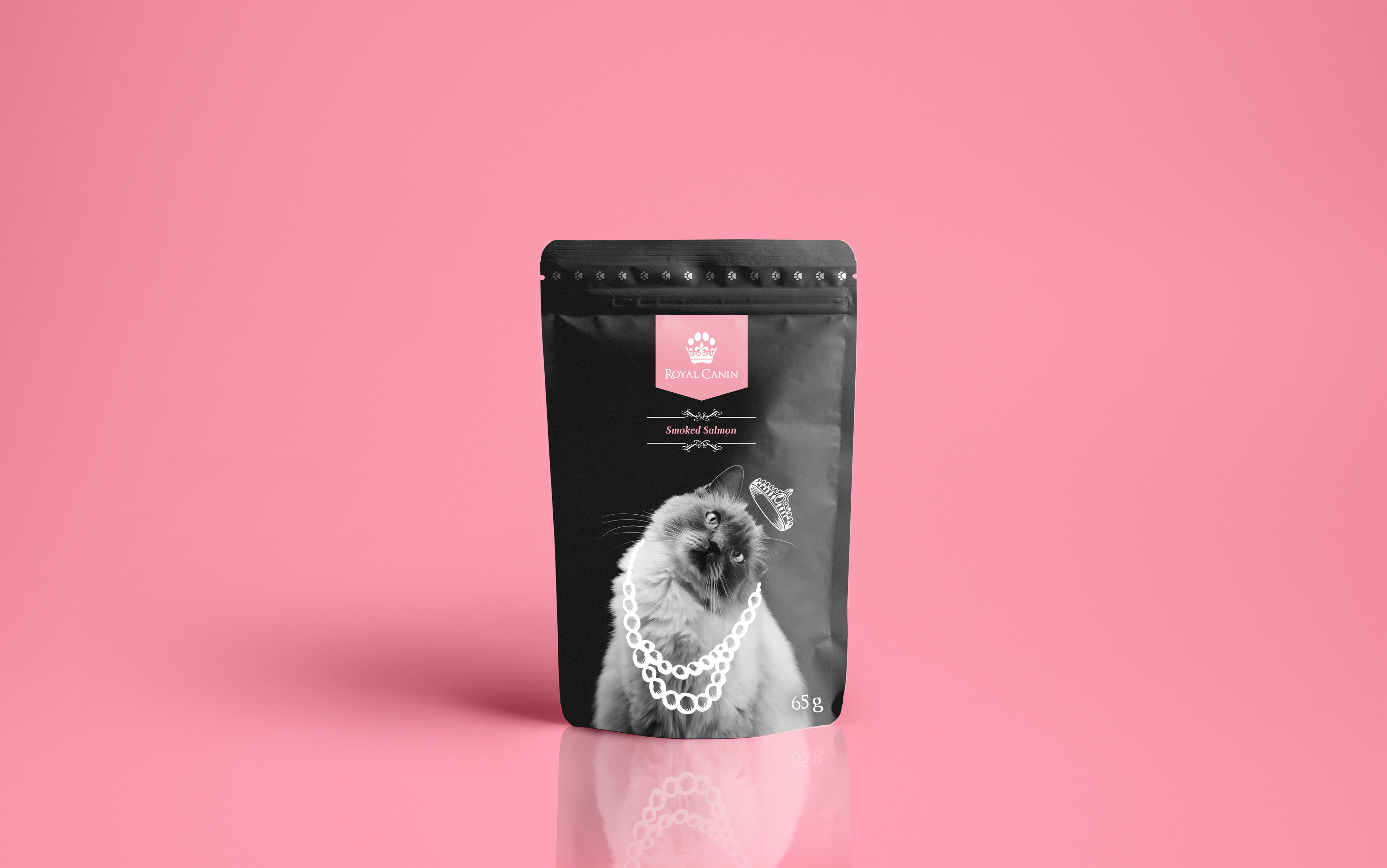 As the majority of pet food brands simply feature a happy looking dog or cat on the label, the inclusion of portrait imagery of animals with their heads held high and angled to create a humour sense of the animals posing to have their portraits taken. Drawing on elements such as crowns and necklaces to visually communicate how us pet owners all see our pets, as little royal additions to the family.